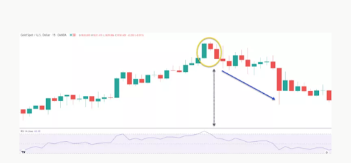 بیایید به نمودار قیمت طلا مراجعه کنیم و به الگوی نمودار ستاره عصرگاهی با اندیکاتور RSI در عمل نگاهی بیندازیم.
